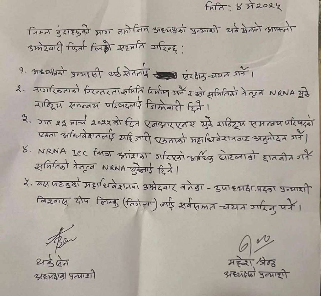 थर्क सेनलाई संरक्षक बनाउने, उनका नजिकका विश्वदीप तिगेलालाई उपाध्यक्ष बनाउने, प्रेमगाह मगरको समितिलाई मान्यता दिने र आफ्नो समितिलाई नागरिकता निरन्तरताको जिम्मेवारी दिने जस्ता शर्तहरूमा उनले अध्यक्षको दावी छाडे (हेर्नुहोस्—सहमतिको हस्ताक्षर गरिएको प्रति)। निर्वाचनलाई पारदर्शी बनाउने शेष घलेको चाहनाविपरीत कुनै पनि पदमा मनोनयनको प्रक्रिया अपनाइएको थिएन। पदहरु बाढी चुँडि गरेर सर्वोच्च अदालत खुल्ने समयभन्दा पहिले हतार–हतार सूची टाँसिएको थियो। सो दिन अधिवेशन सार्ने सम्बन्धी मुद्दाको सर्वोच्च अदालतमा पेशी तोकिएको थियो। त्यसैले सूची टाँस्ने हतारो मुद्दालाई प्रभाव पार्ने नियतले गरिएको देखिन्थ्यो।